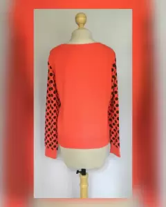 Sudadera Bitono Mickey Mouse. Sudadera bitono CORAL INTENSO/NEGRO ÉBANO, estampado frontal Mickey Mouse, cuello redondo, mangas polka dots y forro interior dry fit. TALLA EEG (REDUCIDA, da mejor a G/EG). Dimensiones cms: 43 hombro, 57 axila, 53 zona baja, 58 largo, 68 largo manga. 48% poliéster, 48% viscosa, 4% elastano. Para lavado en casa.