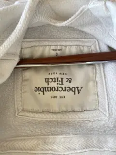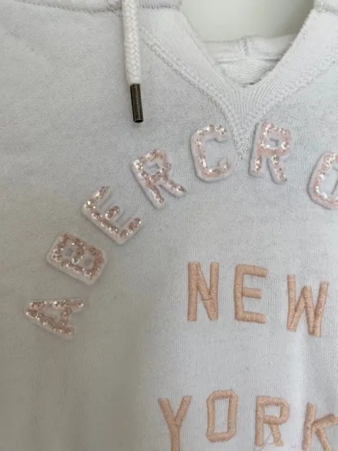 Sudadera blanca Abercrombie. Sudadera blanca con una tela suave por dentro, letras rosas pastel, algunos con brillos. - Talla S