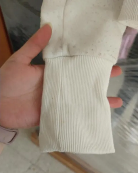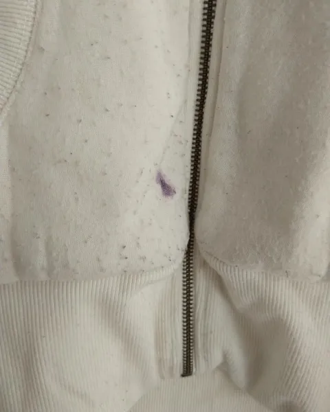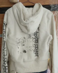 Sudadera blanca con peluche en la parte de adentro, tiene un detalle de mancha de pintura está en las fotos, tiene pedreria en la parte de enfrente, talla L