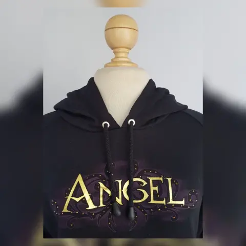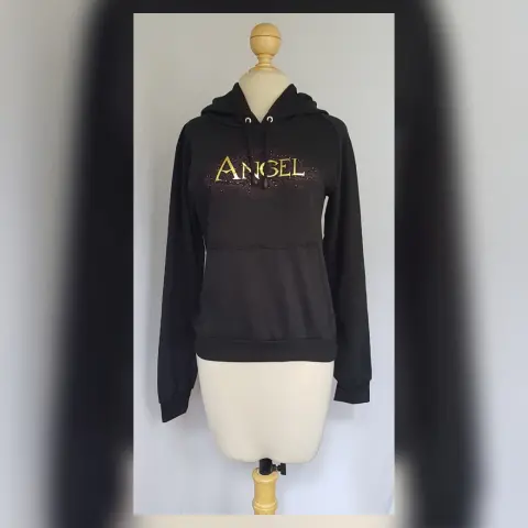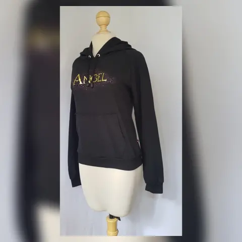 Sudadera color NEGRO ÉBANO c/estampado frontal/trasero c/aplique bisutería mod "PRETTY ANGEL", capucha integrada NO DESMONTABLE c/jaretas, cuello redondo, bolso frontal tipo canguro y manga larga terminada en puño. Talla G. Dimensiones cms: 40 hombro, 52 axila, 41 zona baja, 56 largo, 63 largo manga. 50% algodón, 50% poliéster. P/lavado en casa.