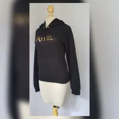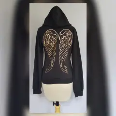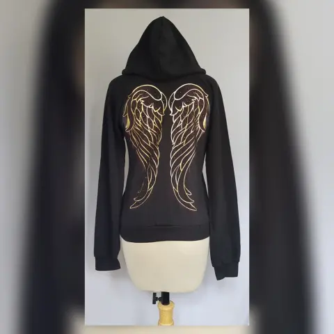 Sudadera c/Capucha Estampada. Sudadera color NEGRO ÉBANO c/estampado frontal/trasero c/aplique bisutería mod "PRETTY ANGEL", capucha integrada NO DESMONTABLE c/jaretas, cuello redondo, bolso frontal tipo canguro y manga larga terminada en puño. Talla G. Dimensiones cms: 40 hombro, 52 axila, 41 zona baja, 56 largo, 63 largo manga. 50% algodón, 50% poliéster. P/lavado en casa.