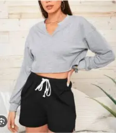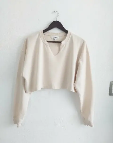 Sudadera corta beige cuello V. Sudadera en tono beige Oversize, tipo Crop con strech; manga larga y luce suelta.De axila a axila: 59 cm.Largo: 38 cmTalla M/LIdeal también para el ejercicio.