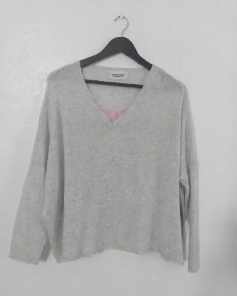 Sudadera de uso, pero aun tiene vida y luce muy linda. Es Oversize. Talla LSe remendo de una partecita casi no se nota (ultima foto) yo le ponia un pin.Tono gris