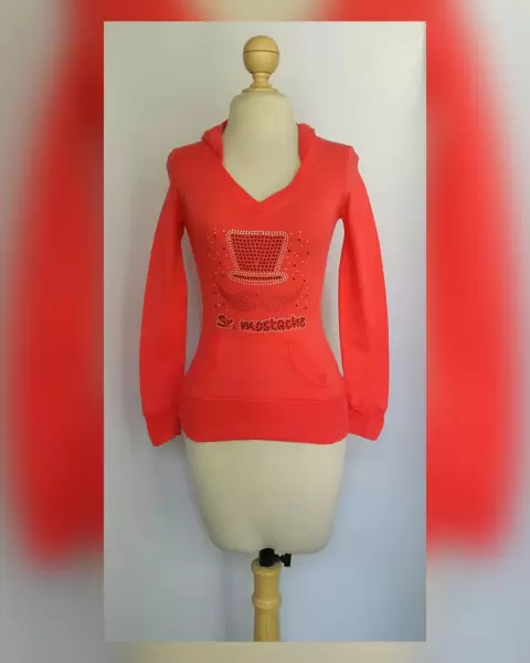 Sudadera ligera color TANGERINA c/capucha NO DESMONTABLE, cuello V, aplique bisutería multicolor, 1 bolso tipo canguro y manga larga terminada en puño. UNITALLA (da a S/M) Dimensiones cms: 34 hombro, 38 axila, 32 cintura, 41 zona baja, 54 largo, 58 largo manga. 100% acrílico. P/lavado casa.***P/LA COMPOSICIÓN ES STRETCH P/SIN SUBIR A LA SIG TALLA***