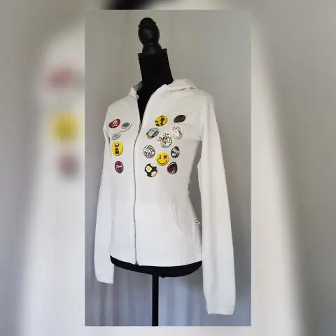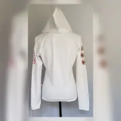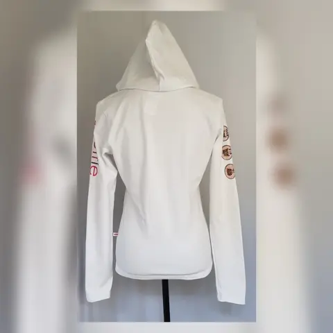 Sudadera color BLANCO POLAR modelo "Bessie-Pines", capucha integrada NO DESMONTABLE, manga larga terminada en puño, cierre p/cremallera y bolso delantero tipo canguro. Talla G. Dimensiones cms: 40 hombro, 49 axila, 41 cintura, 46 zona baja, 61 largo, 67 largo manga. 95% algodón, 5% elastano. Para lavado en casa.***Esta marca maneja prendas de extraordinaria calidad, su algodón es orgánico y soporta ciclos de lavado en máquina sin problemas, no se deslavan los estampados y las telas salen casi sin arrugas.***