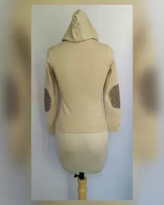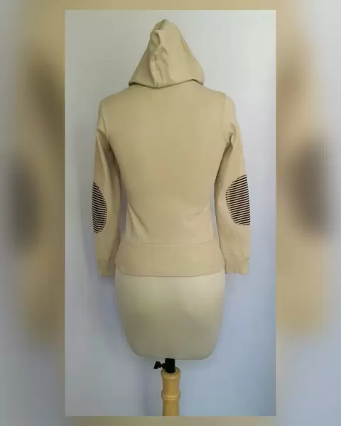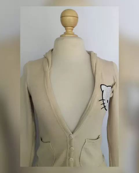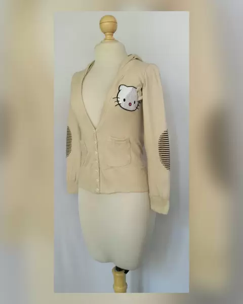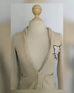 Sudadera ligera tono CAPUCHINO c/capucha NO DESMONTABLE, cuello pico, sin sistema de cierre, botones fantasía delanteros, 2 bolsos plastrón, parche Hello Kitty y parches rayas CAPUCHINO/CHOCOLATE en codos mangas. UNITALLA (da a S/M) Dimen cms: 40 hombro, 44 axila, 38 cintura, 45 zona baja, 48 largo, 56 largo manga 100% acrílico. P/lav casa.**P/LA COMPOSICIÓN ES STRETCH P/SIN SUBIR A LA SIG TALLA**