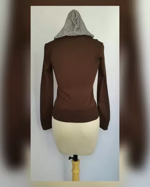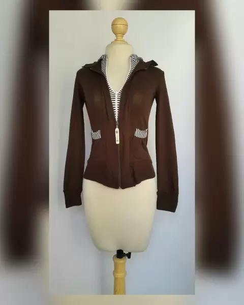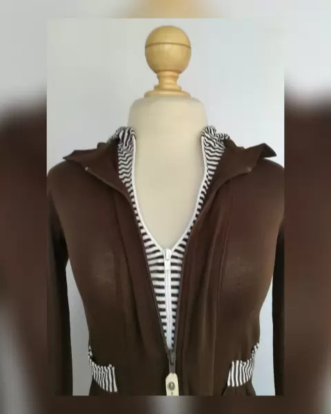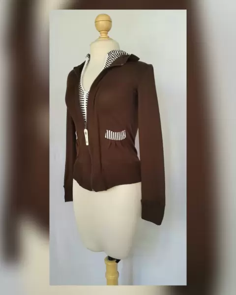 Sudadera ligera tono TABACO c/capucha NO DESMONTABLE, cuello clásico c/solapas, cierre p/doble cremallera, 2 bolsos plastrón, rayas TABACO/BLANCO en capucha, zona frontal y bolsos. UNITALLA (da a S/M) Dimen cms: 38 hombro, 43 axila, 38 cintura, 40 zona baja, 56 largo, 62 largo manga 100% acrílico. P/lav casa.**P/LA COMPOSICIÓN ES STRETCH P/SIN SUBIR A LA SIG TALLA**