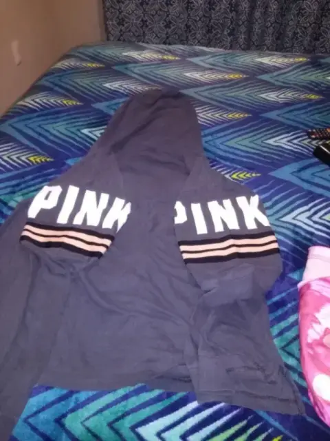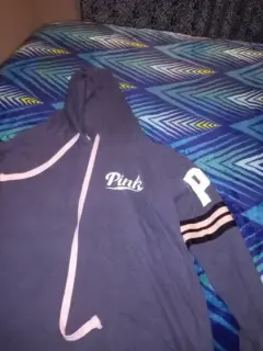 SUDADERA LIGERA CON GORRO PINK. Es color gris, es larga, tiene dos franjas en cada manga, manga larga tiene la marca con letras rosas, en un costado tiene letras de la marca rosas, tiene gorro con correa rosa