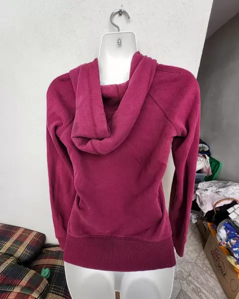 Talla XS, sin detalles, tiene gorro y bolsas, morada, bonita y cómoda