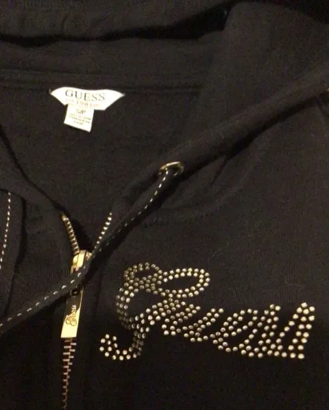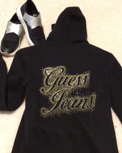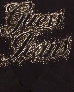 Sudadera negra GUESS. Sudadera fashion negra con logos en pedrería dorada en perfecto estado. No decolorada ni deslavada. Talla S.