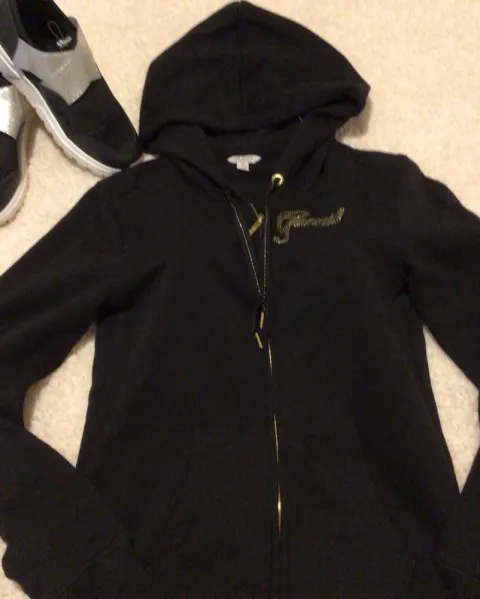 Sudadera fashion negra con logos en pedrería dorada en perfecto estado. No decolorada ni deslavada. Talla S.