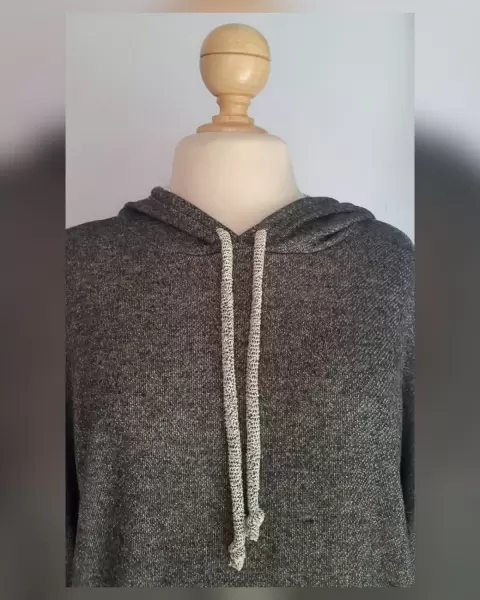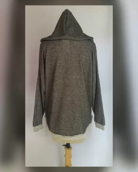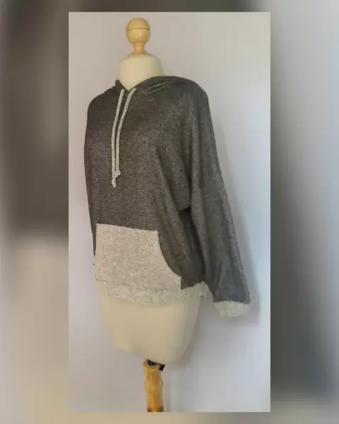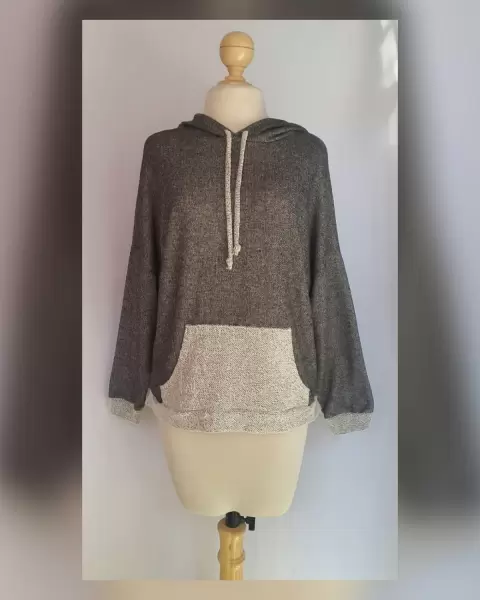 Sudadera oversize tejido punto c/estructura bitono GRIS PIZARRA/GRIS ÁRTICO con capucha c/jaretas mismo tejido, manga larga terminada en puño, solapa delantera tipo canguro. Talla M. Dimensiones cms: 78.5 hombro, 71.5 axila, 57 zona baja, 60 largo delantero, 72 largo trasero, 40 largo manga. 96% viscosa, 4% elastano. P/lavado en casa.
