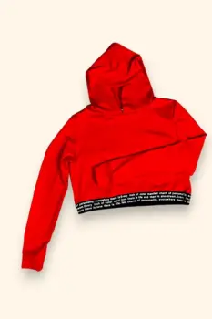 Sudadera Roja corta. Sudadera corta en color rojo con freses estampadas en el elástico negro, trae capucha se ve lo máximo mis Pinky Lovers ¡que no te la ganen!😎