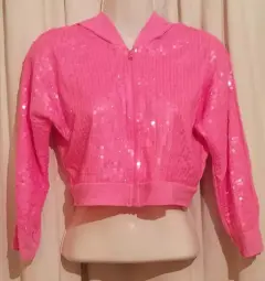 Bonita sudadera corta, color rosa, con lentejuela rosa en el frente, cierre frontal, muy bonito diseño, con gorra, marca justice, talla 18 ( checar medidas), mide en hombros 42 cm, en pecho 47 cm, en cintura 38 cm y de largo tiene 40 cm. En excelente estado