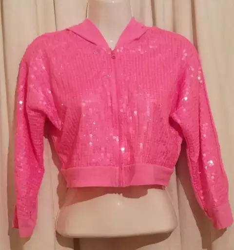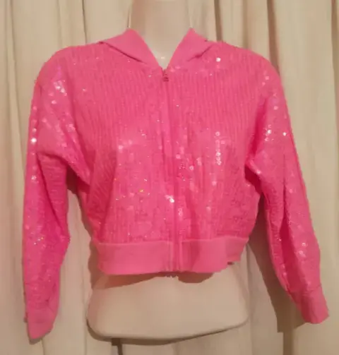 Sudadera rosa corta con gorra. Bonita sudadera corta, color rosa, con lentejuela rosa en el frente, cierre frontal, muy bonito diseño, con gorra, marca justice, talla 18 ( checar medidas), mide en hombros 42 cm, en pecho 47 cm, en cintura 38 cm y de largo tiene 40 cm. En excelente estado
