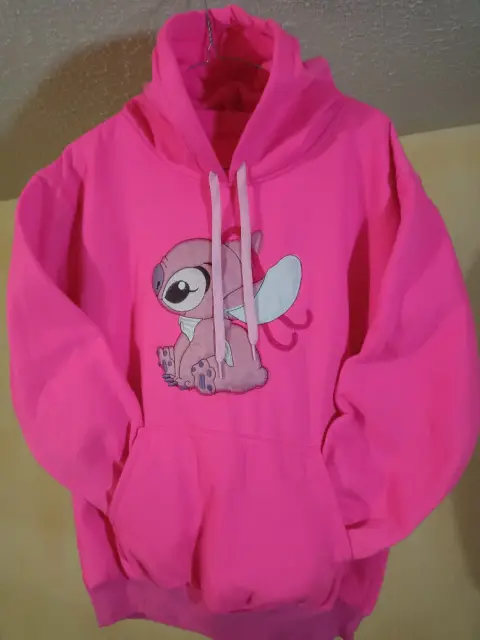 SUDADERA STICH ROSA. Sudadera tela afelpada,bordada,no gruesa y calientita, talla Mediana (34-36), con capucha.