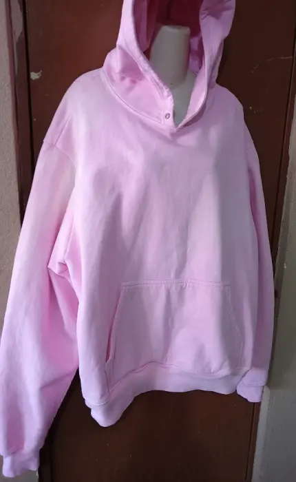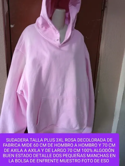 SUDADERA TALLA PLUS 3XL. SUDADERA DE ALGODÓN TALLA PLUS 3XL USADA BUEN ESTADO MIDE 60 CM DE HOMBRO A HOMBRO Y 70CM DE AXILA A AXILA Y 70 CM DE LARGO DETALLE DOS PEQUEÑAS MANCHAS EN LA BOLSA MUESTRO FOTO DE ESO ES ROSA CON DECOLORACIÓN DE FABRICA