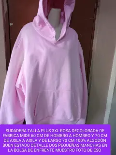 SUDADERA DE ALGODÓN TALLA PLUS 3XL USADA BUEN ESTADO MIDE 60 CM DE HOMBRO A HOMBRO Y 70CM DE AXILA A AXILA Y 70 CM DE LARGO DETALLE DOS PEQUEÑAS MANCHAS EN LA BOLSA MUESTRO FOTO DE ESO ES ROSA CON DECOLORACIÓN DE FABRICA