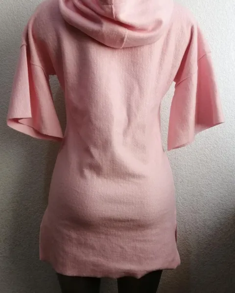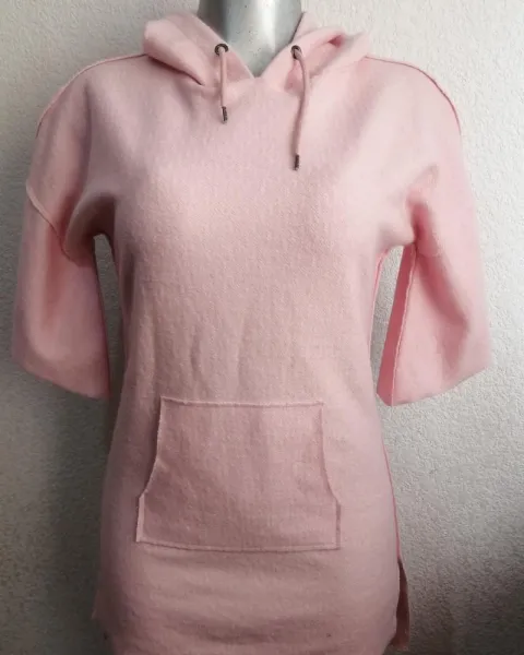 Sudadera vestido largo rosa clarito. Hermosa sudadera larga con abertura a los lados, bolsa frontal, mangas cortas, no tiene etiquetas internas ni de nuevo, pero si es nuevo. Queda a talla s/m. Medidas largo 76cm, axila a axila 53cm, largo manga 24.5cm