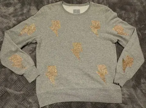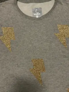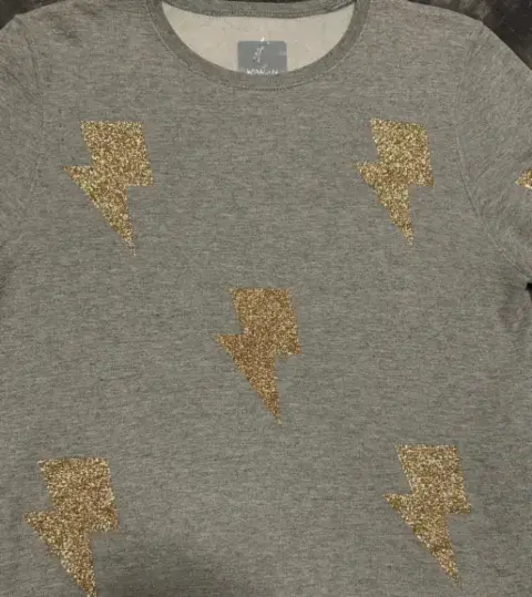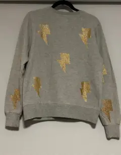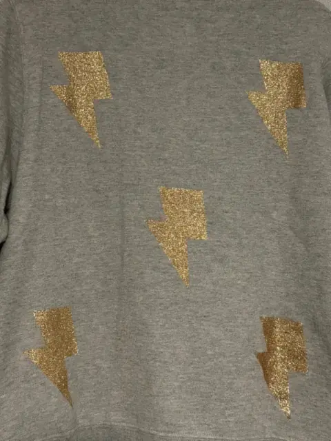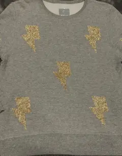 Susadera con rayos. Sudadera gris con parches de rayos dorados ⚡️⚡️en color talla mediana, afelpada por dentro, la tela no estira. Es usada y tiene un poco de pelusa que se puede retirar con una quita pelusas) *última foto de referenciaMedidas:Cintura 48 cmBusto 51 cmLargo 61 cm