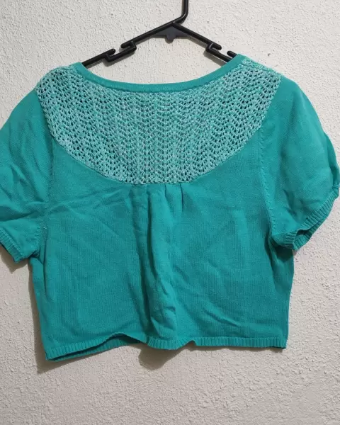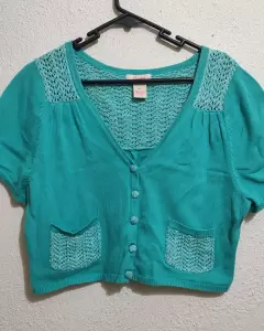Hermoso abriguito crop o torerita de manga corta, color aqua, tiene bordado en la parte de la espalda y también en las bolsitas, sus botones también están forrados y muy lindos. Prácticamente está nuevo porque lo use como dos o tres veces. Queda a XL y considero que a L también.