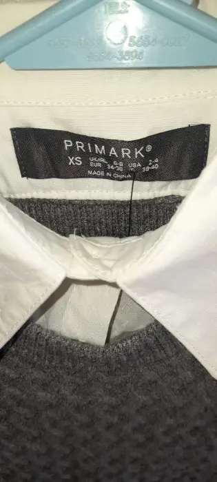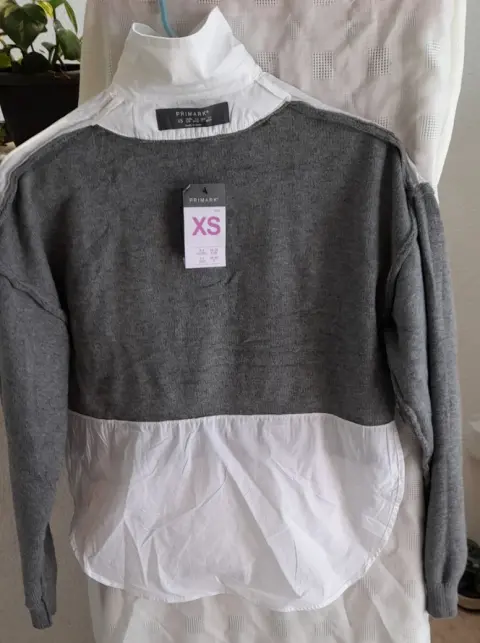 Hermosa blusa con sueter, color gris oxford y blanco, talla Xs, es nueva, no trae detalle, el sueter es delgado,material-poliester, algodón, hombro a hombro-52, axila a axila-47,largo del sueter-33, largo de la manga-50, total del largo, 53, en las imágenes se muestra el reverso de la blusa con el sueter.