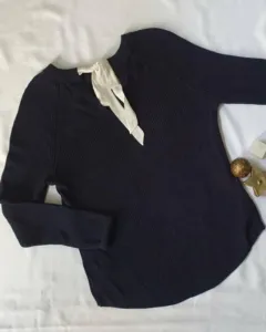 Es una blusa tipo sueter, de la parte de atrás tiene un listón que hace que luzca aún mas lindo.