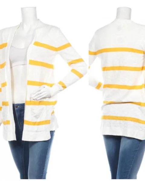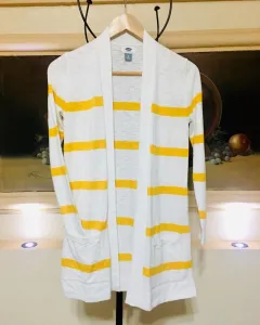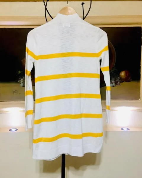 Cardigan blanco con franjas amarillas. 🌼 Está prenda esta increíble, es casual y el color esta hermoso, en la ultima foto te dejo como queda puesto, cero detalles, esta listo para ti… 📏medidas: Hombro-hombro 35cm, largo desde el hombro 76cm.🤑Si es tu primera compra utiliza mi código: ✨ maryicm21apKif ✨ te regalo $100 en tu primera compra (aplica solo para compras con valor de $1,000 o más)