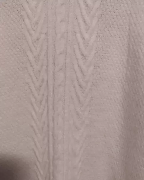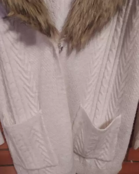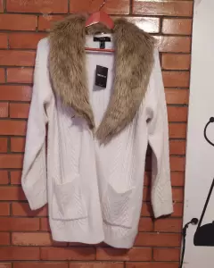 Lindísimo Cardigan beige, con cuello de pelo sintético removible, bolsillos al frente y broche.