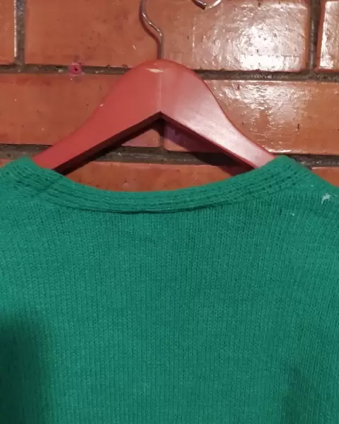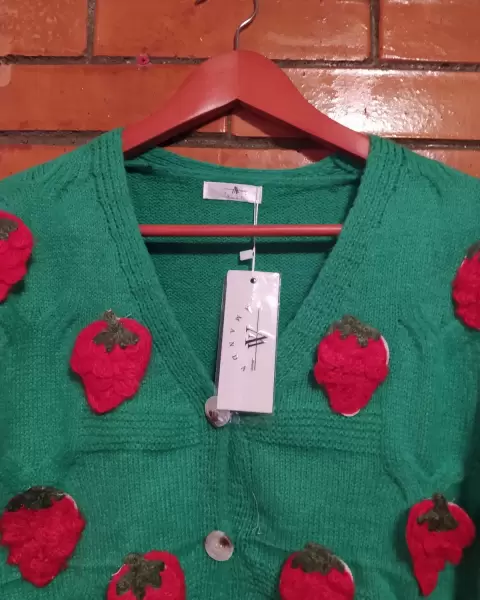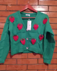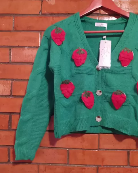 Cardigan de punto Amanda. Lindísimo Cardigan de punto, verde oscuro, con aplicación de fresas bordadas, cuello V, botones al frente, Unitalla.