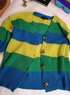 Hermoso cardigan de punto talla ch.Tiene colores muy vivos.Medidas:Axila a axila 47 cmLargo 51 cmManga 49 cmPor el tipo de tela estira hasta 10 cm mas.Solo se usó 2 veces.