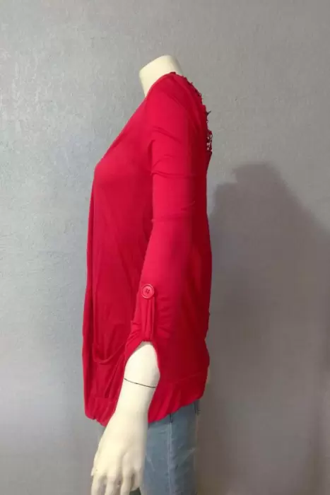Cardigan rojo, Manga 3/4. con diseño tipo ganchillo en espalda, Asimetrico de los costados de enfrente tela ligera,Tela ligera. (Da de una talla S a una M)