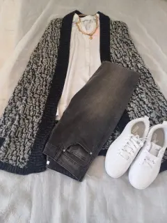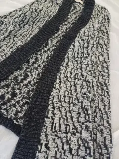 Hermoso cárdigan en tonos grises. Es tejido y largo. Es abierto sin botones.Medidas hombros 38 CM, ax a ax 43 CM, largo 82 cm.
