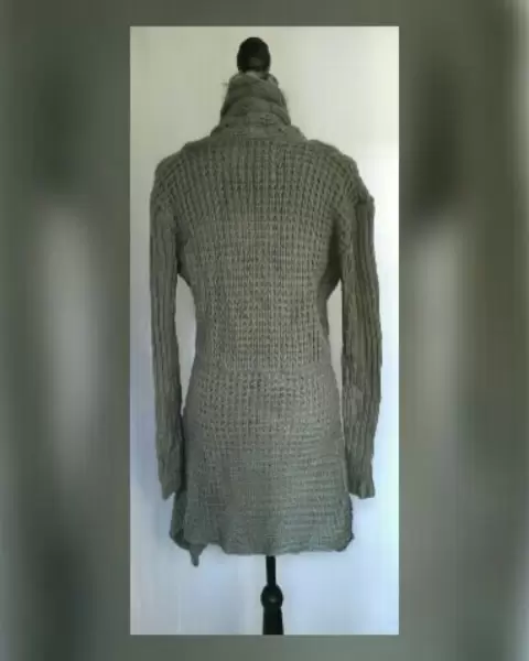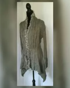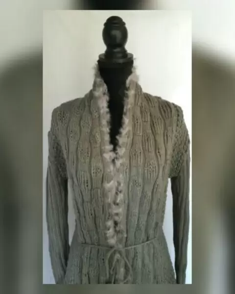 Cardigan en tejido de punto con estructura color GRIS LOBO, cuello pico, cierre por jareta mismo tejido c/borlas en cintura, aplique faux fur en zona frontal y cuello y manga larga. Talla M. Dimensiones cms: 50 hombro, 56 axila, 49 cintura, 100 zona baja, 88 largo, 67 largo manga. 100% acrílico. Para lavado en casa.