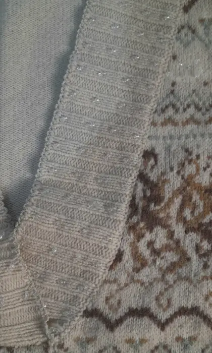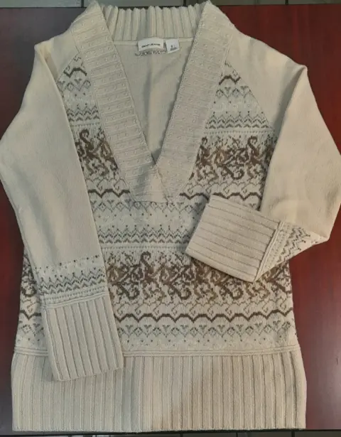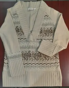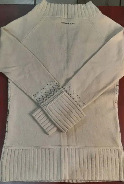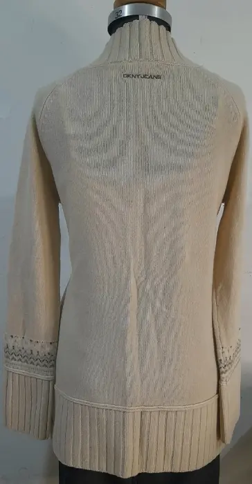 Sueter largo para dama, SEMINUEVO, marca DKNY, talla L (grande), color beige, cuerpo 100% de punto, decorado en tonos café y azul claro, lindos detalles de chaquira, cuello V, 100% lana de borrego.