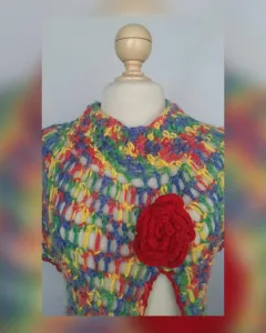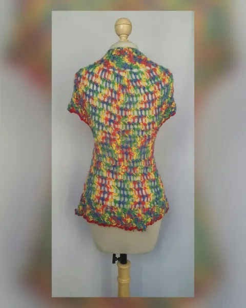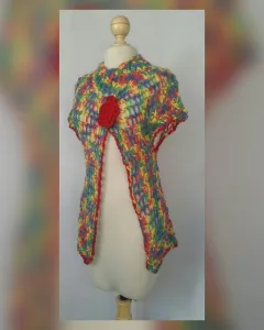 Ensamble en tejido de punto c/estructura multicolor en tonos ROJO/VERDE/AMARILLO/AZUL, cuello Perkins, aplique flor mismo tejido y manga corta. UNITALLA (Da a S/M). Dimensiones cms: 40 hombro, 42 axila, 55 zona baja, 75 largo, 16 largo manga. 100% acrílico. Para lavado en casa.