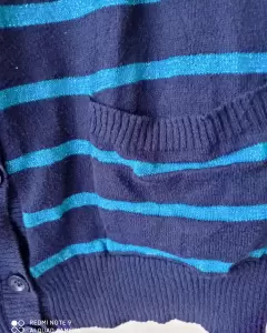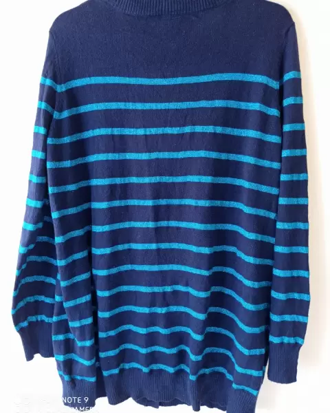 Hermoso súeter de rallitas,azul con brillos. Padrísimo suéter,super suave y cómodo.sin detalles,con color intacto.medidas:78cm largo,43cm de hombro y 67cm axila.