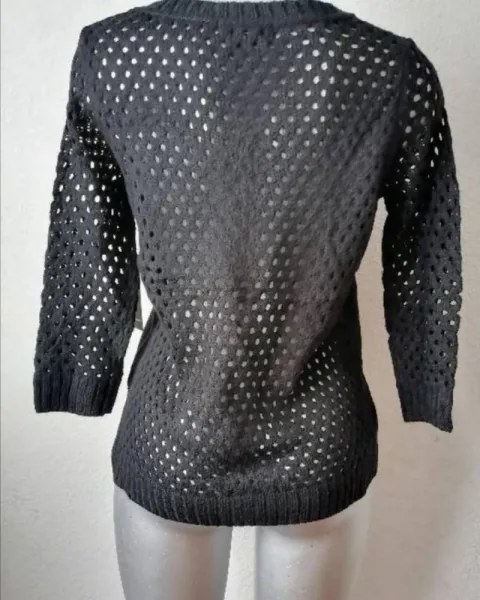 Hermoso suéter negro con hoyuelos. Suéter super bonito negro, de la espalda y en mangas es de puntadas abiertas, puntadas cerradas enfrenteLargo manga 47 cmLargo frente 58 cmLargo trasero 63.5 cmAxila a axila 45.5 cmHombro a hombro 34.5cm