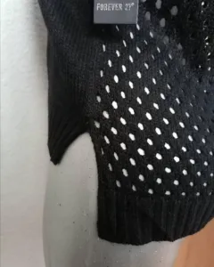 Suéter super bonito negro, de la espalda y en mangas es de puntadas abiertas, puntadas cerradas enfrenteLargo manga 47 cmLargo frente 58 cmLargo trasero 63.5 cmAxila a axila 45.5 cmHombro a hombro 34.5cm