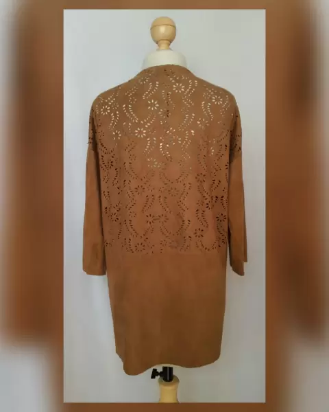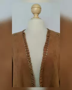 Kimono Canale efecto Ante. Kimono canale efecto ante color OCRE DORADO TOSTADO, cuello pico, sin sistema de cirre, espalda canale y manga 3/4. Talla M (da a M/L). Dimensiones cms: 60 hombro, 59 axila, 64 zona baja, 78 largo, 36 largo manga. 92% poliéster, 8% elastano. Para lavado en casa.