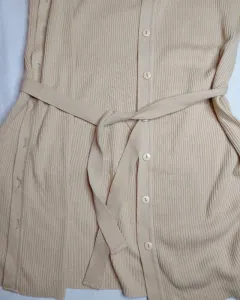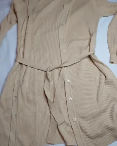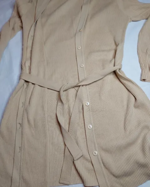 Lindo cardigan color camello, es ligero, tiene botones y cinturón, lo puedes usar con o sin cinturón. No tiene mingun detalle.