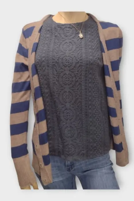 OLD NAVY Cárdigan Dama Algodón Azul MCárdigan marca OLD NAVY 53% Algodón 40% Nylon 7% ViscosaMarca: OLD NAVYOrigen: ChinaMaterial: 53% Algodón 40% Nylon 7% ViscosaTalla: MEstilo: CárdiganPatrón: CasualColor: Azul Marino y Marrón Cierre: BotónPecho: 49 cmLargo: 64 cmHombro: 40 cmManga: 67 cmRopa de USO en muy buen estado