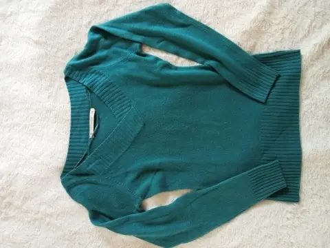 Suéter en cuello V, calientes. Verde esmeralda y turquesa en talla 1, negro en talla 2.