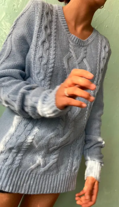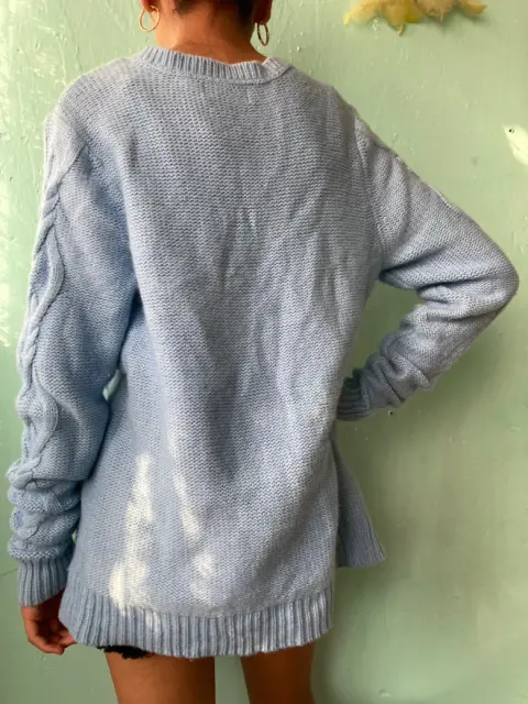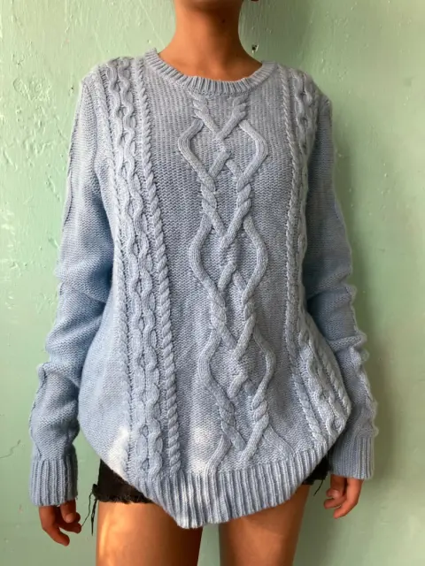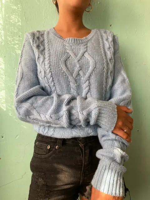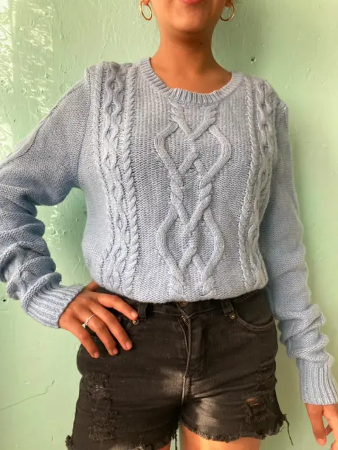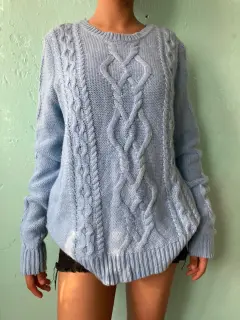 Suéter azul cielo, es tejido y está precioso. Talla L (le queda bien a alguien talla S/M), no tiene ninguna mancha ni detalle.