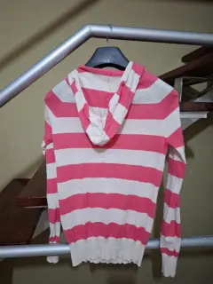 Suéter a rayas, sport bicolor beige/coral ligero y cómodo, talla L reducida creo queda mejor a M solo dos puestas.