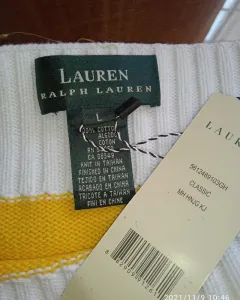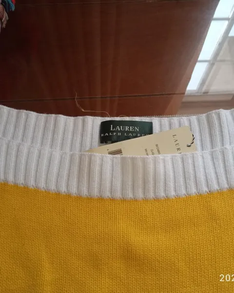 Suéter a rayas Ralph Lauren. Sueter de punto a rayas colores amarillo y blanco, cuello cuadrado, talla L, con escudo de marca bordado, padrísimo e impecable, original, nuevo a estrenar con etiquetas. Te va a encantar. Queda a talla 36mx suelto, queda desde M tipo over size.Medidas:Axila a axila 55cmHombro a hombro 43cmCintura 54cmCadera 49cmMangas 67 cmLargo 64 cm