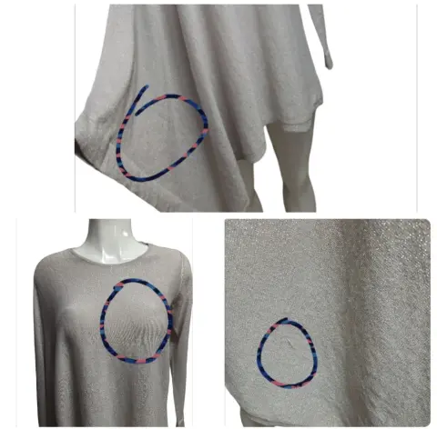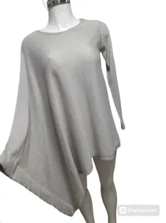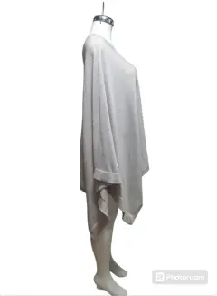 Sueter Asimétrico Gris Perla, la tela tiene acabado brilloso, suave y ligera, tiene una manga compñeta y del otro lado el espacio para meter la otra mano, es talla S pero tambien queda a M, tiene 3 hilos jalados detalle en la ultima foto, puesto no se ven