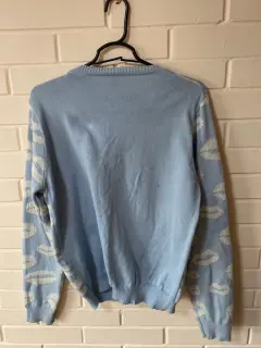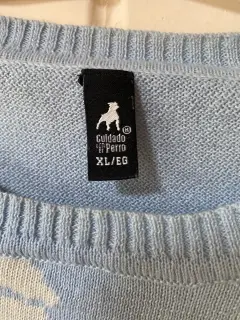 Suéter azul claro. Excelente para clima templado frío Color azul claroEstampado de labios color blancoTalla XL/EG50% poliéster 35% viscosa15% acrílico