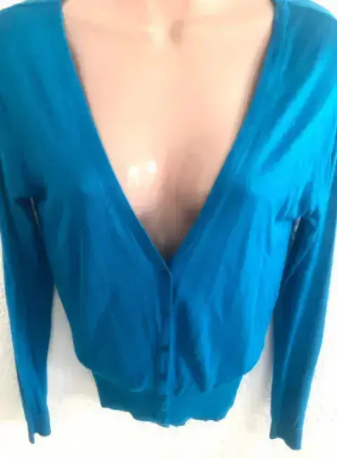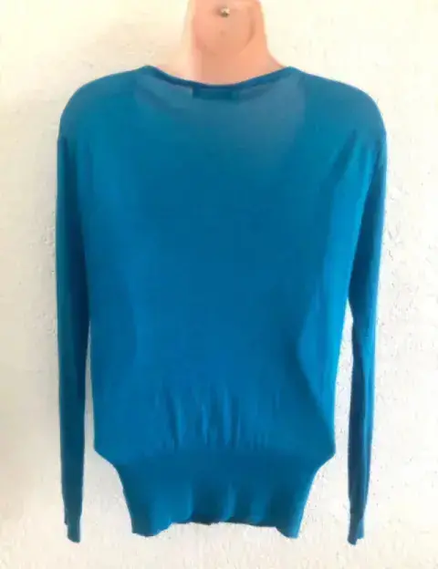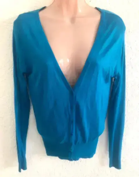 Suéter azul con botones al frente con manga larga cuello en V , es muy delgado to y suave para esta temporada, el tono de azul está muy lindo.