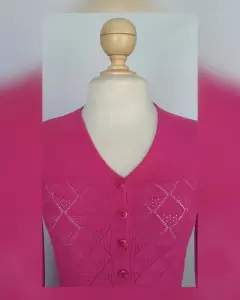 Suéter Básico Tejido Punto c/Estructura. Suéter básico en tejido de punto c/estructura tono BUGAMBILIA, cuello V, cierre p/botonadura. Unitalla (da a S/M). Dimensiones cms: 36 hombro, 40 axila, 42 zona baja, 56 largo, 64 largo manga. 100% acrìlico. Para lavado en casa.